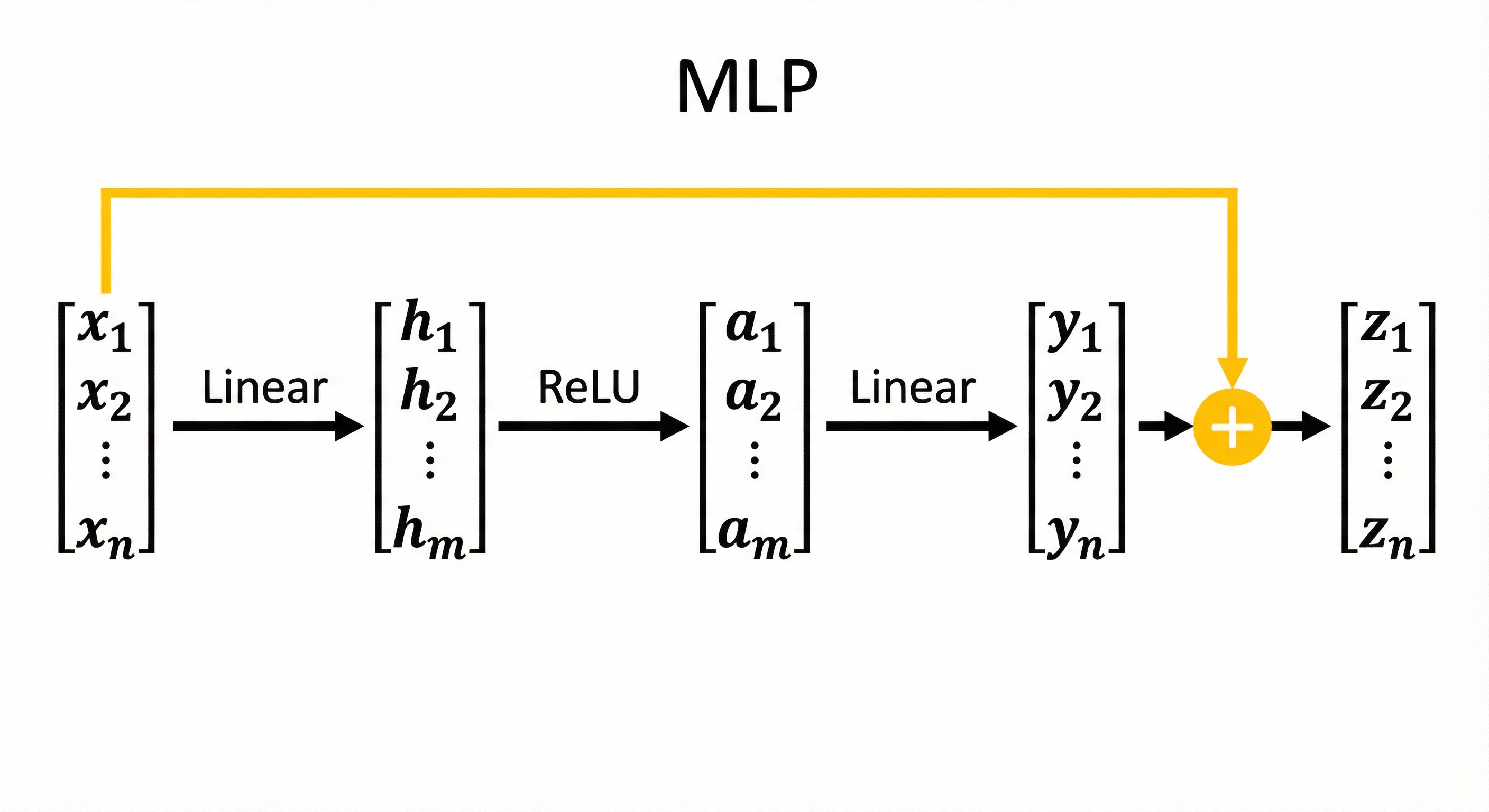 MLP的第一层进行升维,通过激活函数进行非线性变换,然后在第二层降维,最后与输入相加。